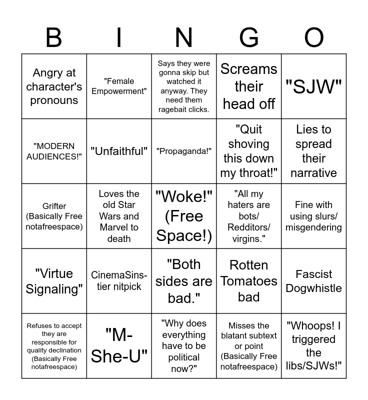 This bingo card has a free space and 53 words: "This is for the normies.", "Whoops! I triggered the libs/SJWs!", "These characters from movies 40 years ago are good examples of strong women.", Misses the blatant subtext or point (Basically Free notafreespace), CinemaSins-tier nitpick, Ironically loves movies that were Anti-Capitalist/Fascist, "Female Empowerment", "Far-Left Mob", "MODERN AUDIENCES!", Doesn't care about the politics in Right-Wing movies, "Unfaithful", "I'm not racist/ misogynist/ queerphobic!", Fascist Dogwhistle, Rotten Tomatoes bad, "Mary Sue", Refuses to accept they are responsible for quality declination (Basically Free notafreespace), "Propaganda!", "All my haters are bots/ Redditors/ virgins.", "You just don't want to admit the movie is bad.", "SJW", Loves the old Star Wars and Marvel to death, "Hollywood/ Movie Company is going bankrupt.", "Quit shoving this down my throat!", Angry at character's pronouns, "Forced Diversity" (Basically Free notafreespace), "M-She-U", Can't stand seeing POC/LGBTQ+ character (Basically Free notafreespace), "The men are incompetent.", Gives minority character an anti-minority nickname, Lies to spread their narrative, "Good movies don't exist anymore.", "THE MESSAGE!", Calls their critics soyjaks, Unironic use of "Triggered Liberal" memes from 2015, "Those characters can't be ____. That makes no sense.", "They're trying to indoctrinate us/ the children!", Screams their head off, "Why does everything have to be political now?", Says they were gonna skip but watched it anyway. They need them ragebait clicks., Videogame footage, Hypocritically forgiving to movies with minorities decades ago or were very well received, Only says "movie woke" when it doesn't make triple the budget at the box office/ it's direct-to-streaming, Fine with using slurs/ misgendering, Calls it woke garbage before it even came out, Responds to criticism using Whataboutism and Ad Hominem, "Both sides are bad.", Fine with harassing the writers or actors, "They ruined our heroes.", Grifter (Basically Free notafreespace), "Virtue Signaling", "Culture War", "Hollywood/ Movie Company is doing this to avoid criticism." and Constantly pumps out 8+ minute videos.