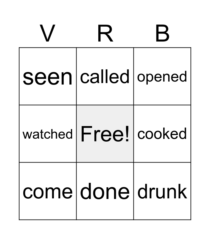 This bingo card has a free space and 20 words: walked, played, cooked, talked, listened, watched, closed, opened, cleaned, called, been, had, done, gone, come, eaten, drunk, seen, taken and given.