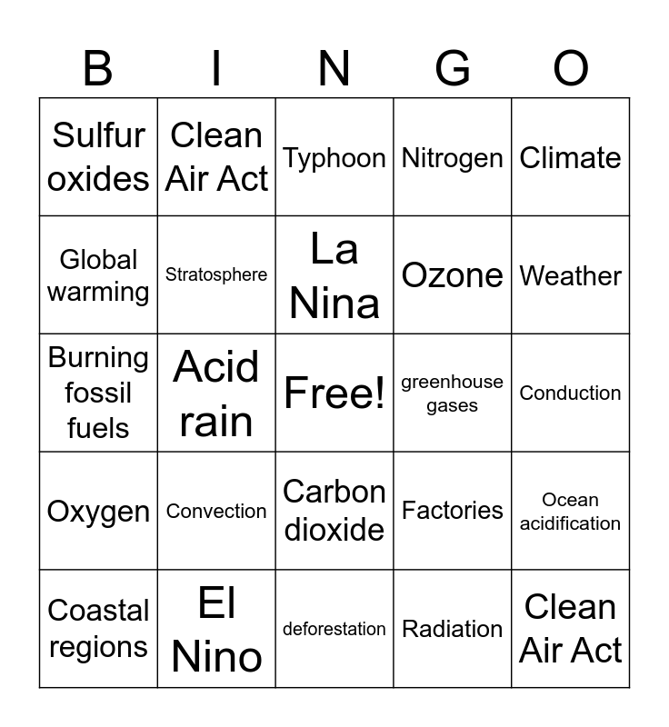 This bingo card has a free space and 24 words: Convection, El Nino, La Nina, Coastal regions, Climate, Sulfur oxides, Global warming, Clean Air Act, greenhouse gases, Carbon dioxide, Ozone, Burning fossil fuels, Factories, Ocean acidification, Stratosphere, Radiation, Conduction, Typhoon, Weather, Acid rain, Clean Air Act, Oxygen, Nitrogen and deforestation.