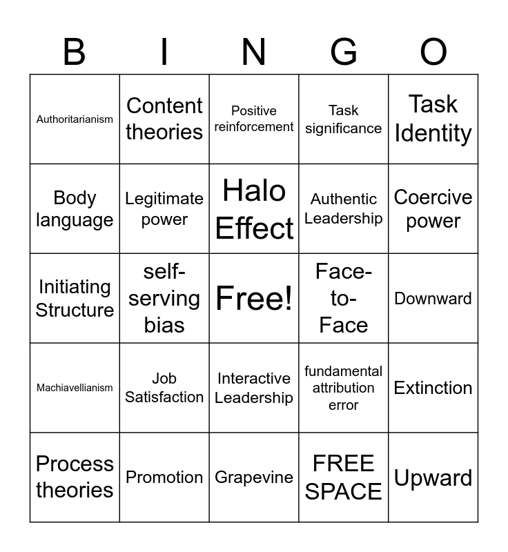 This bingo card has a free space and 24 words: Job Satisfaction, Promotion, Halo Effect, Process theories, Task Identity, Authoritarianism, Body language, Content theories, Face-to-Face, Interactive Leadership, Authentic Leadership, Initiating Structure, fundamental attribution error, Extinction, Legitimate power, FREE SPACE, Downward, Positive reinforcement, Coercive power, self-serving bias, Upward, Machiavellianism, Task significance and Grapevine.