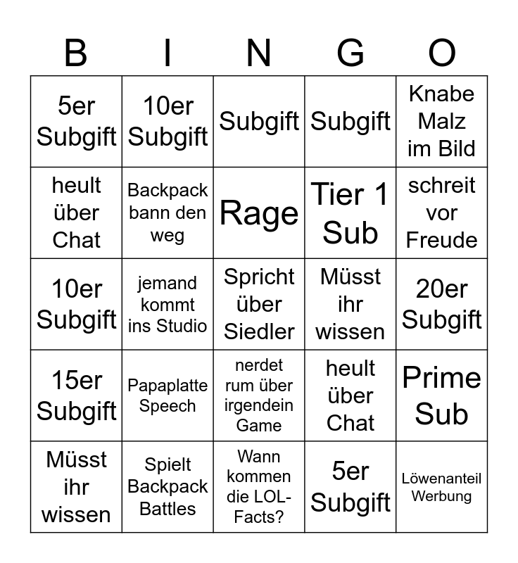 This bingo card has a free space and 24 words: Papaplatte Speech, Spielt Backpack Battles, Rage, Müsst ihr wissen, Knabe Malz im Bild, 5er Subgift, heult über Chat, 10er Subgift, Müsst ihr wissen, nerdet rum über irgendein Game, Tier 1 Sub, 10er Subgift, heult über Chat, Prime Sub, Backpack bann den weg, 5er Subgift, 20er Subgift, Subgift, schreit vor Freude, jemand kommt ins Studio, Löwenanteil Werbung, 15er Subgift, Subgift and Wann kommen die LOL-Facts?.