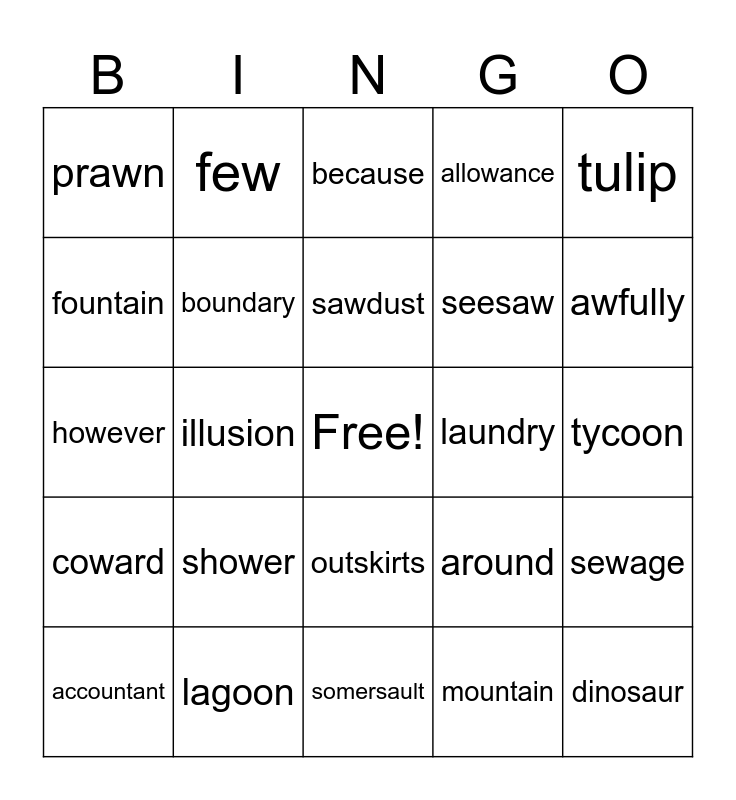 This bingo card has a free space and 24 words: shower, lagoon, sawdust, accountant, tulip, prawn, fountain, few, laundry, outskirts, seesaw, however, around, sewage, boundary, mountain, tycoon, because, awfully, illusion, dinosaur, coward, allowance and somersault.