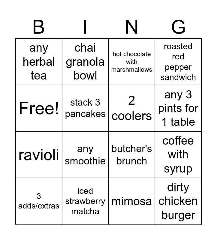 This bingo card has 16 words: iced strawberry matcha, coffee with syrup, hot chocolate with marshmallows, any herbal tea, ravioli, chai granola bowl, butcher's brunch, mimosa, Free!, stack 3 pancakes, 3 adds/extras, roasted red pepper sandwich, any smoothie, any 3 pints for 1 table, 2 coolers and dirty chicken burger.