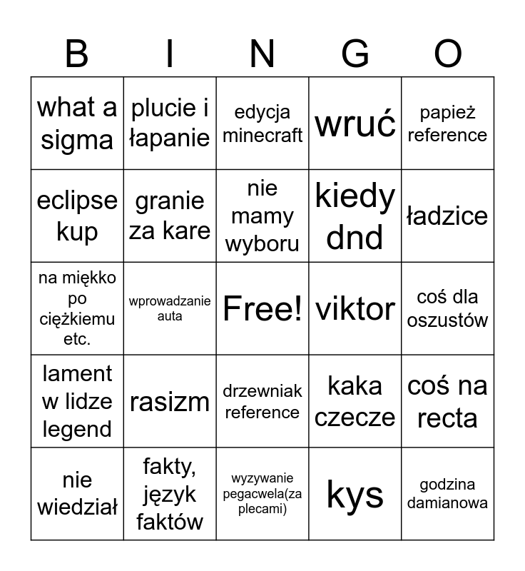 This bingo card has a free space and 73 words: co za cwel, brain damage, what a sigma, jebanie damiana, wyzywanie od ukraińców, jebanie biedronki, lament w lidze legend, grill u mosta, kaka czecze, ambatukam, 7 days free, czarne dupska, granie za kare, coś dla oszustów, co za guwno wysłałeś, plucie i łapanie, wyzywanie pegacwela(za plecami), eclipse kup, gjubsy glubsy czipsy laysy niksy, viktor, nie mamy wyboru, wruć, papież reference, aushwitz/autyzm, nie wiedział, 10na10, łech, pierd elummowy, bek szymonowy, przegłos, fakty, język faktów, kiler ciekawostka, głupi i głupszy bracia stolec, jysk reference, wprowadzanie auta, lore, bredzisz, ty to jesteś gość, godzina damianowa, naprawili, kys, rasizm, komunizm, montage, kłótnie o nic, kiedy dnd, edycja minecraft, jebanie paradoxu, bandyctwo, na miękko po ciężkiemu etc., ap skała bomba, śpiączka (gjuby), smyrgiel, arcane, pedaliada, miażdżenie jajec, amogus, drzewniak reference, stary ..............., niggerkyscwel, telefon (narzędzie zbrodni), wątek fekalny, gumowice, ładzice, kfc, cziki nagets, dupom (discord), wyślij to na klasyki, coś na recta, ze mnie tam nie ma, wada wymowy, słowotwórstwo gjubego and coś się otwiera coś się zamyka.