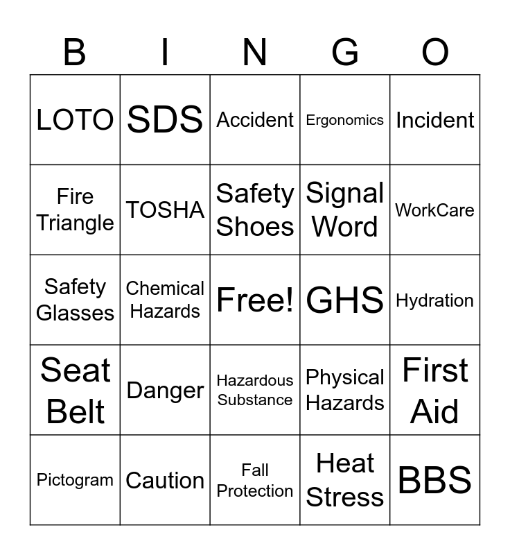 This bingo card has a free space and 24 words: Danger, Caution, Safety Shoes, Pictogram, Incident, LOTO, Fire Triangle, SDS, GHS, Hazardous Substance, Signal Word, Safety Glasses, Physical Hazards, First Aid, TOSHA, Heat Stress, Hydration, Accident, WorkCare, Chemical Hazards, BBS, Seat Belt, Ergonomics and Fall Protection.