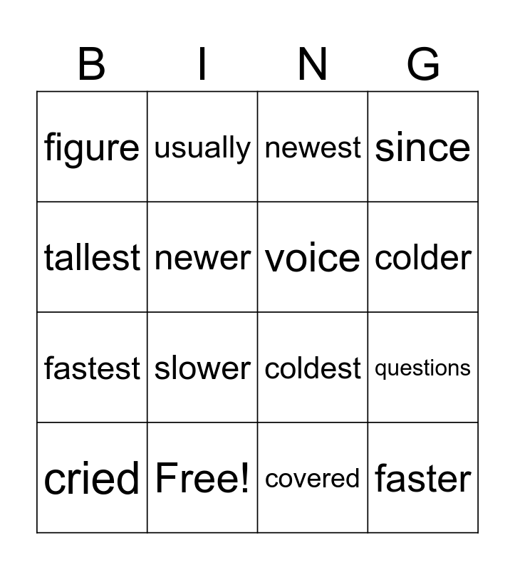 This bingo card has 21 words: Free!, money, usually, products, covered, voice, figure, newest, coldest, colder, fastest, since, faster, taller, newer, slowest, cried, slower, tallest, questions and horse.