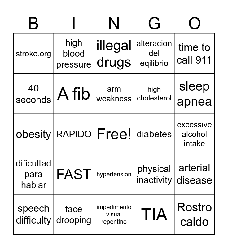 This bingo card has a free space and 24 words: FAST, face drooping, arm weakness, speech difficulty, time to call 911, stroke.org, 40 seconds, high blood pressure, diabetes, hypertension, high cholesterol, obesity, physical inactivity, arterial disease, A fib, TIA, excessive alcohol intake, illegal drugs, sleep apnea, RAPIDO, Rostro caido, dificultad para hablar, alteracion del eqilibrio and impedimento visual repentino.
