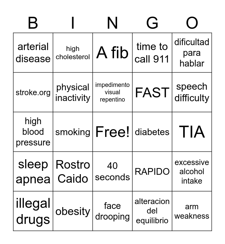 This bingo card has a free space and 24 words: Rostro Caido, obesity, impedimento visual repentino, illegal drugs, dificultad para hablar, arterial disease, stroke.org, high cholesterol, diabetes, 40 seconds, FAST, high blood pressure, RAPIDO, excessive alcohol intake, physical inactivity, alteracion del equilibrio, TIA, A fib, speech difficulty, smoking, arm weakness, sleep apnea, time to call 911 and face drooping.