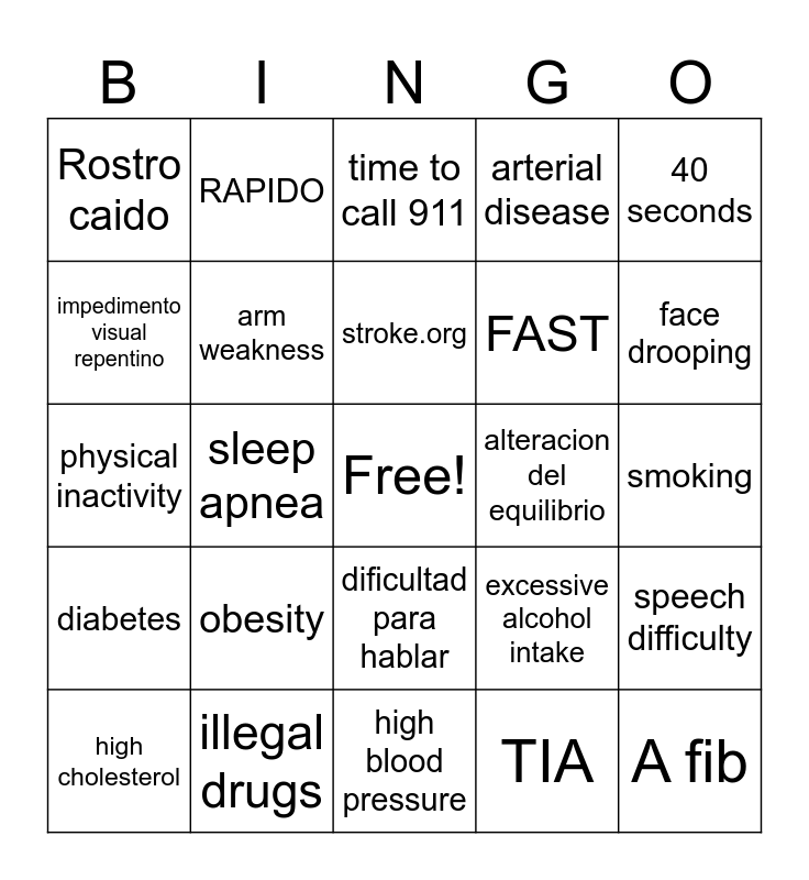 This bingo card has a free space and 24 words: obesity, illegal drugs, stroke.org, high cholesterol, 40 seconds, Rostro caido, impedimento visual repentino, RAPIDO, alteracion del equilibrio, dificultad para hablar, FAST, physical inactivity, excessive alcohol intake, speech difficulty, arm weakness, TIA, smoking, time to call 911, face drooping, sleep apnea, A fib, diabetes, arterial disease and high blood pressure.