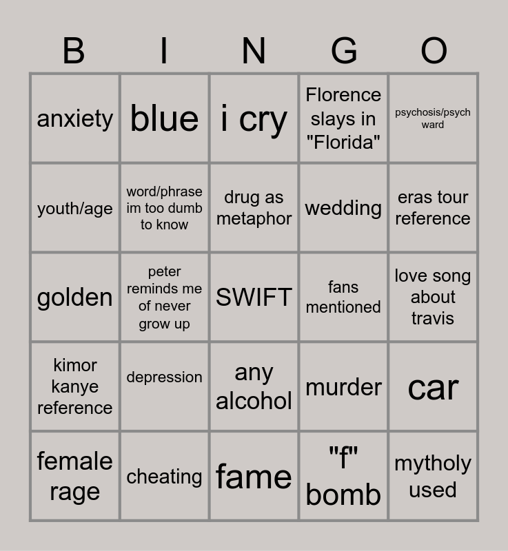 This bingo card has a free space and 25 words: depression, fame, drug as metaphor, female rage, psychosis/psych ward, anxiety, youth/age, blue, fans mentioned, any alcohol, wedding, golden, murder, car, word/phrase im too dumb to know, deep breath, love song about travis, i cry, eras tour reference, peter reminds me of never grow up, mytholy used, cheating, kimor kanye reference, Florence slays in "Florida" and "f" bomb.