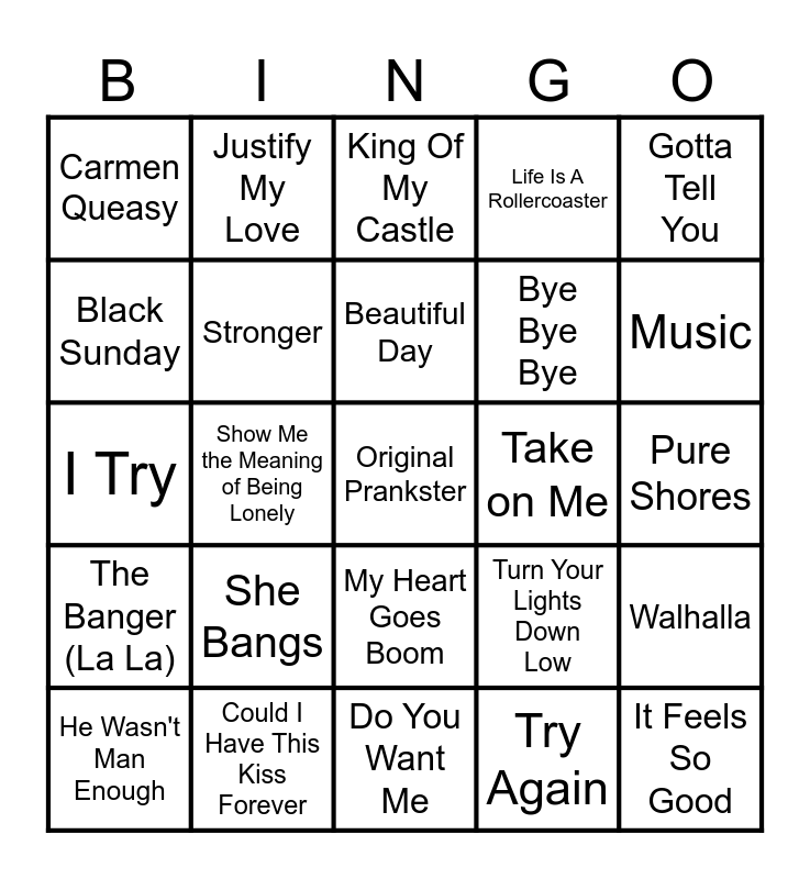 This bingo card has 140 words: Free!, Will 2K (feat. K-Ci), The Bad Touch, Heut' ist mein Tag, Everytime, Turn Your Lights Down Low, Adelante, Born to Make You Happy, (You Drive Me) Crazy, Rhythm Divine, Ocean (Radio Mix), I Have a Dream, The Final Countdown 2000, That's The Way It Is, Flying Without Wings, I Need to Know, Don't Call Me Baby, Happy New Year, Don't Say You Love Me, If I Could Turn Back the Hands of Time -, Dear Jessie -, Walhalla, Move Your Body, The Masses Against the Classes, Sexbomb, Show Me the Meaning of Being Lonely, Justify My Love, Cartoon Heroes -, Freestyler, Caught Out There, All I Really Want, The Great Beyond, Girl in Oslo, Pure Shores, Start Rockin' -, Stand Inside Your Love, American Pie, Rise, Bye Bye Bye, Go Let It Out, Movin Too Fast, I Wanna Love You Forever, My Heart Goes Boom, Summer Moved On -, Say My Name, If Only, The Whistle Song, Sparkles (Airscape Remix), Maria Maria - Radio Mix, Reinspikka Hip Hop, Dancing in the Moonlight, Around The World, He Wasn't Man Enough, Oops!...I Did It Again, Nothing As It Seems, It's My Life, Private Emotion, Thong Song, The Wicker Man, Fly On The Wings Of Love, It Feels So Good, Try Again, Campione 2000 -, Lastima, Amazed, The Banger (La La), The Real Slim Shady, Shackles (Praise You), The Whistle Song, New Glow, Loving You Girl -, Carmen Queasy, I Try, Lollipop, Sandstorm, I'm Outta Love, Take A Look Around, Inside To Outside -, Life Is A Rollercoaster, Rock DJ, Doesn't Really Matter, Electric, Lucky, Luvstruck - Original Mix, Music, 7 Days, Take on Me, It's Gonna Be Me, Do You Want Me, Hiphopper (feat. Teddybears Sthlm) - Single Edit, Turn That Sound Up, Feel The Beat -, You see the trouble with me - We'll Be In Trouble, Could I Have This Kiss Forever, Catch Us, Vamos A Bailar (Esta Vida Nueva), Against All Odds (Take a Look at Me Now), Lady (Hear Me Tonight), What It Is, La luna, Black Sunday, We Are The Playmomen, Sky -, Black Coffee, Beautiful Day, Can't Get Over You, I Need Direction, Shape of My Heart, Holler -, She Bangs, Sunset (Bird Of Prey) -, My Love, Gotta Tell You, Original Prankster, Same Old Brand New You, Stronger, Gravel Pit (feat. RZA, Method Man, Ghostface Killah, Raekwon & U-God), Silence - Dj Tiesto's In Search Of Sunrise Remix, Don't Tell Me, On Your Own, Walking Away, 911, Who Let The Dogs Out, Stan, Love Thing, Overload - Edit, Psychological Effects, Luv U More, Dancing in the Moonlight, Calling You, Out of Your Mind (feat. Victoria Beckham) -, Toca Me - Clubmix, Protect Your Mind (Braveheart), The Darkside, You Sang To Me, King Of My Castle, All The Small Things, Fill Me In, Groovejet (If This Ain't Love) and Shalala Lala.