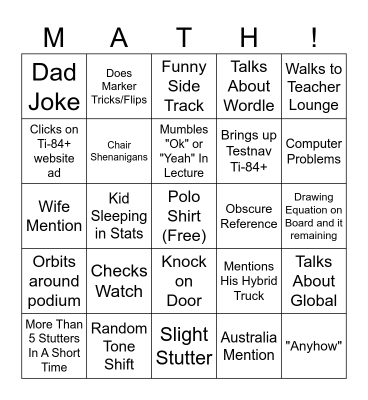 This bingo card has a free space and 30 words: Random Tone Shift, Upstairs Loud Noise, Kid Sleeping in Stats, Son Mention, Dad Joke, Funny Side Track, Chair Shenanigans, Knock on Door, Obscure Reference, Slight Stutter, Drawing Equation on Board and it remaining, "Anyhow", Australia Mention, Mad at ehallpass, Computer Problems, Adjusts shorts/pants, Mentions His Hybrid Truck, Orbits around podium, Checks Watch, Walks to Teacher Lounge, Wife Mention, Scholastic Bowl Mention, Does Marker Tricks/Flips, Brings up Testnav Ti-84+, Clicks on Ti-84+ website ad, Talks About Wordle, Talks About Global, More Than 5 Stutters In A Short Time, Mumbles "Ok" or "Yeah" In Lecture and Points Off for No Unit.