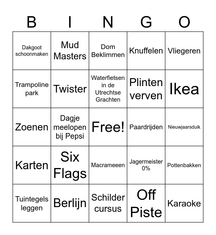 This bingo card has a free space and 24 words: Six Flags, Berlijn, Waterfietsen in de Utrechtse Grachten, Tuintegels leggen, Vliegeren, Dakgoot schoonmaken, Trampoline park, Mud Masters, Paardrijden, Macrameeen, Plinten verven, Zoenen, Jagermeister 0%, Pottenbakken, Twister, Off Piste, Nieuwjaarsduik, Dom Beklimmen, Ikea, Dagje meelopen bij Pepsi, Karaoke, Karten, Knuffelen and Schilder cursus.