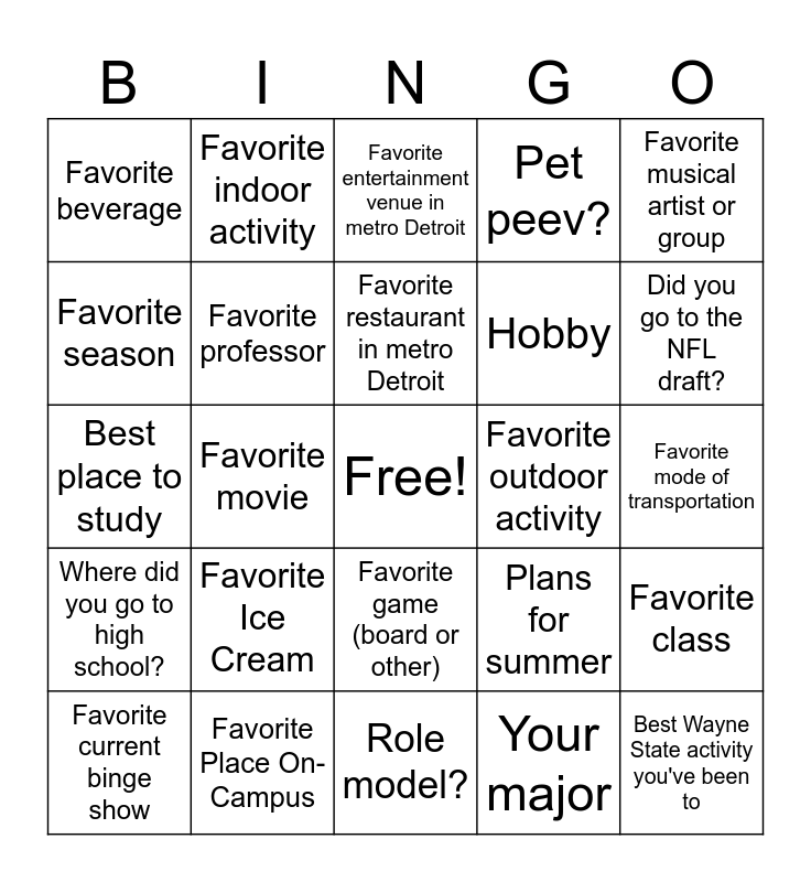 This bingo card has a free space and 24 words: Favorite Ice Cream, Favorite Place On-Campus, Favorite restaurant in metro Detroit, Favorite current binge show, Favorite musical artist or group, Favorite beverage, Favorite season, Favorite indoor activity, Favorite outdoor activity, Favorite game (board or other), Hobby, Best place to study, Plans for summer, Favorite class, Favorite professor, Your major, Favorite mode of transportation, Favorite entertainment venue in metro Detroit, Did you go to the NFL draft?, Favorite movie, Best Wayne State activity you've been to, Where did you go to high school?, Pet peev? and Role model?.