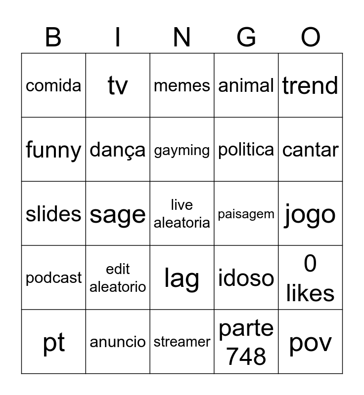 This bingo card has a free space and 24 words: edit aleatorio, anuncio, gayming, pt, trend, comida, funny, tv, paisagem, lag, politica, slides, idoso, 0 likes, dança, parte 748, jogo, memes, cantar, sage, pov, podcast, animal and streamer.