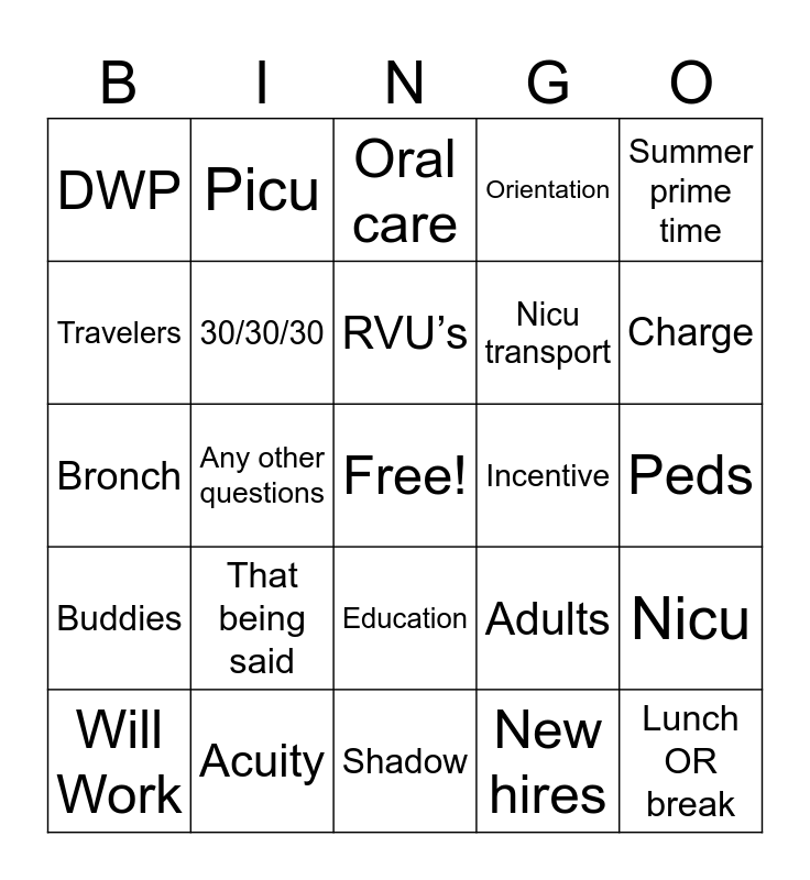 This bingo card has a free space and 24 words: That being said, Acuity, RVU’s, Will Work, Summer prime time, DWP, Travelers, Picu, Incentive, Education, Nicu transport, Bronch, Adults, Nicu, 30/30/30, New hires, Peds, Oral care, Charge, Any other questions, Lunch OR break, Buddies, Orientation and Shadow.