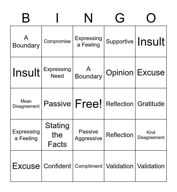 This bingo card has a free space and 27 words: Reflection, Reflection, Opinion, Compliment, Insult, Expressing a Feeling, Compromise, Expressing a Feeling, Reflection, Kind Disagreement, Mean Disagreement, Supportive, Excuse, Confident, Excuse, Apology, Expressing Need, A Boundary, Stating the Facts, A Boundary, Gratitude, Validation, Passive, Validation, Passive Aggressive, Insult and Kind Disagreement.