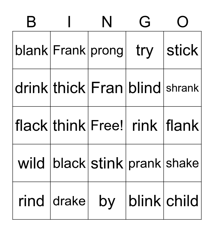 This bingo card has a free space and 24 words: black, drake, Fran, rind, stick, blank, drink, Frank, rink, stink, blind, flack, prank, shake, thick, blink, flank, prong, shrank, think, child, wild, try and by.