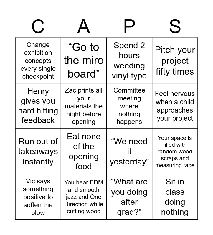 This bingo card has 16 words: You hear EDM and smooth jazz and One Direction while cutting wood, Your space is filled with random wood scraps and measuring tape, Spend 2 hours weeding vinyl type, Change exhibition concepts every single checkpoint, Run out of takeaways instantly, “Go to the miro board”, “We need it yesterday”, “What are you doing after grad?”, Henry gives you hard hitting feedback, Zac prints all your materials the night before opening, Vic says something positive to soften the blow, Pitch your project fifty times, Eat none of the opening food, Feel nervous when a child approaches your project, Committee meeting where nothing happens and Sit in class doing nothing.
