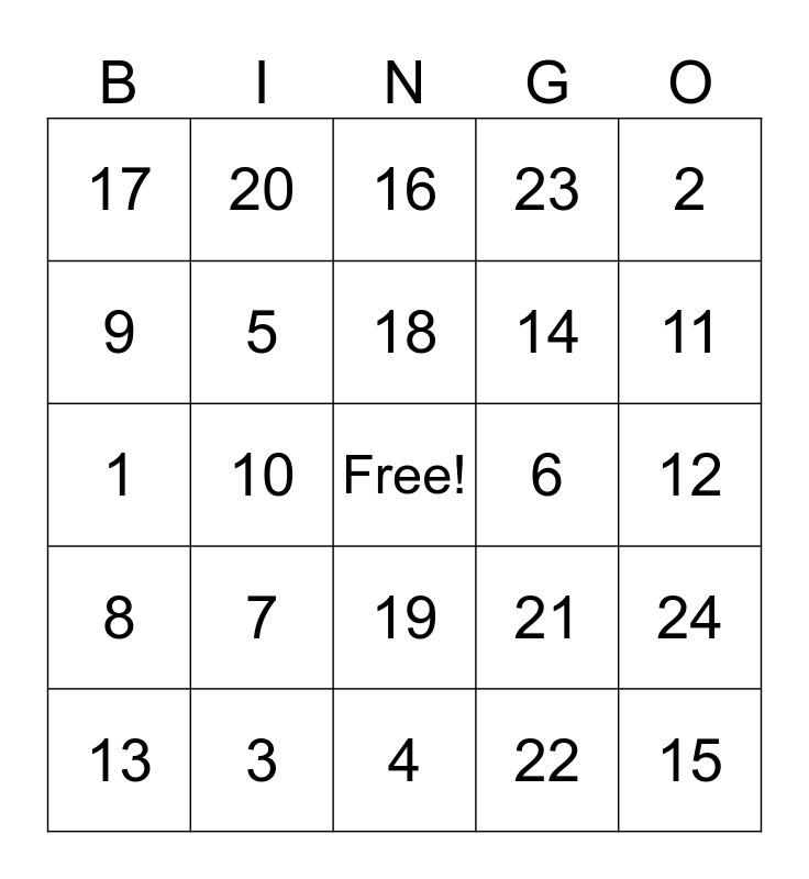 This bingo card has a free space and 24 words: 7, 3, 18, 13, 2, 17, 9, 20, 6, 19, 14, 1, 21, 24, 5, 22, 12, 16, 11, 10, 15, 8, 23 and 4.