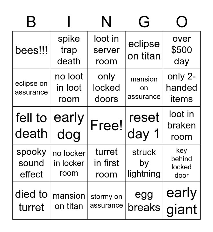 This bingo card has a free space and 24 words: no locker in locker room, mansion on titan, only locked doors, died to turret, over $500 day, bees!!!, eclipse on assurance, spike trap death, reset day 1, turret in first room, mansion on assurance, fell to death, struck by lightning, key behind locked door, no loot in loot room, egg breaks, loot in braken room, loot in server room, only 2-handed items, early dog, early giant, spooky sound effect, eclipse on titan and stormy on assurance.