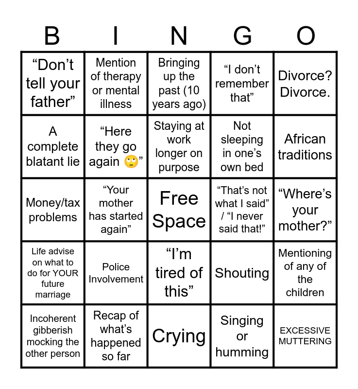 This bingo card has a free space and 29 words: Incoherent gibberish mocking the other person, Swear words, “Your mother has started again”, Mention of family members or relatives (dead or alive), “Don’t tell your father”, Bringing up the past (10 years ago), “Here they go again 🙄”, Police Involvement, “That’s not what I said” / “I never said that!”, Recap of what’s happened so far, “Where’s your mother?”, EXCESSIVE MUTTERING, Crying, Singing or humming, African traditions, “Your father has started again”, “I’m tired of this”, Life advise on what to do for YOUR future marriage, Divorce? Divorce., Money/tax problems, Shouting, “You caused all this!”, Not sleeping in one’s own bed, A complete blatant lie, “I don’t remember that”, Mention of therapy or mental illness, Mentioning of any of the children, Staying at work longer on purpose and Quarreling in front of Auntie.