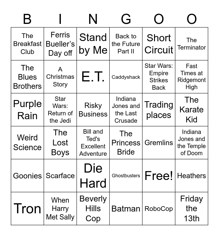 This bingo card has 37 words: Free!, Ghostbusters, RoboCop, The Blues Brothers, The Lost Boys, Trading places, A Christmas Story, Batman, Short Circuit, Tron, Fast Times at Ridgemont High, Back to the Future Part II, Purple Rain, Risky Business, The Terminator, Indiana Jones and the Last Crusade, Scarface, Stand by Me, The Karate Kid, Star Wars: Return of the Jedi, The Breakfast Club, Caddyshack, Bill and Ted's Excellent Adventure, Gremlins, When Harry Met Sally, Indiana Jones and the Temple of Doom, Ferris Bueller’s Day off, Beverly Hills Cop, Heathers, Die Hard, Labyrinth, The Princess Bride, Star Wars: Empire Strikes Back, Goonies, Weird Science, E.T. and Friday the 13th.
