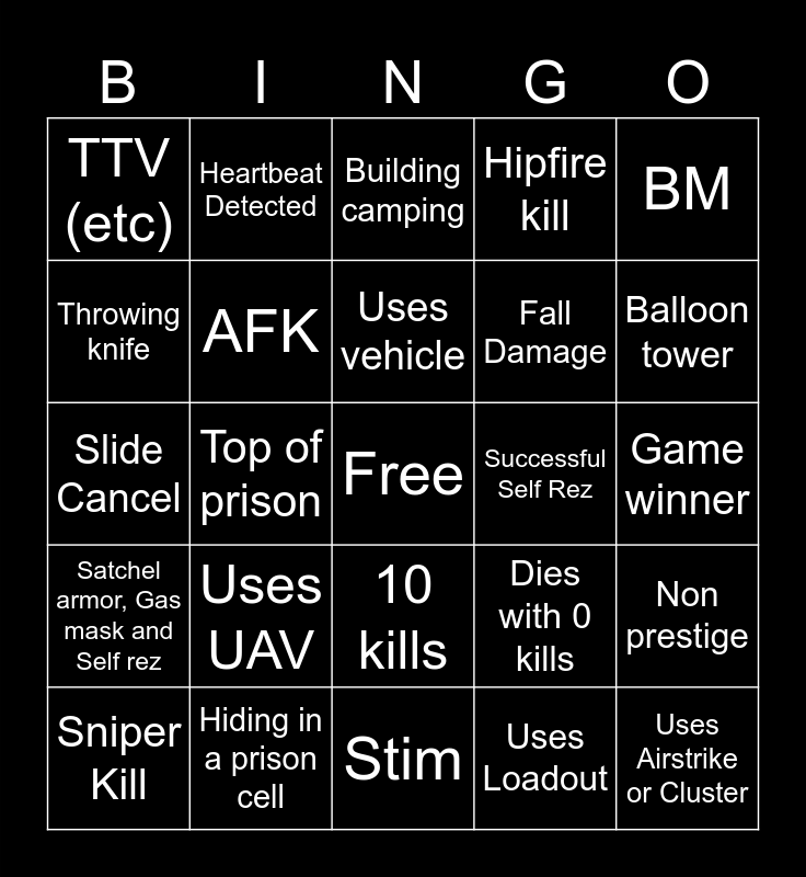 This bingo card has a free space and 24 words: Uses UAV, Hiding in a prison cell, Uses vehicle, Sniper Kill, BM, TTV (etc), Throwing knife, Heartbeat Detected, Successful Self Rez, 10 kills, Fall Damage, Slide Cancel, Dies with 0 kills, Non prestige, AFK, Uses Loadout, Game winner, Building camping, Balloon tower, Top of prison, Uses Airstrike or Cluster, Satchel armor, Gas mask and Self rez, Hipfire kill and Stim.