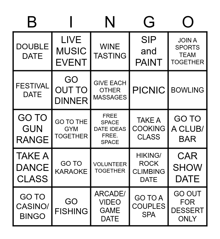 This bingo card has a free space and 39 words: WINDOW SHOP/ MALL WALK, LOCAL STAYCATION, TAKE A NEW LANGUAGE CLASS, GO OUT TO DINNER, GO TO CASINO/ BINGO, VOLUNTEER TOGETHER, GIVE EACH OTHER MASSAGES, GO CAMPING, JOIN A SPORTS TEAM TOGETHER, TAKE A DANCE CLASS, GO TO THE GYM TOGETHER, SIP and PAINT, GO OUT FOR DESSERT ONLY, GO TO A CLUB/ BAR, TAKE A COOKING CLASS, GO TO KARAOKE, WALK IN THE PARK, DOUBLE DATE, RUN A MARATHON TOGETHER, HIKING/ ROCK CLIMBING DATE, FESTIVAL DATE, ARCADE/ VIDEO GAME DATE, PICNIC, BOWLING, RUN ERRANDS TOGETHER, SPORTING EVENT, TAKE A TRIP, TAKE POTTERY/ CANDLE/ FRAGRANCE MAKING CLASS, MOVIE DATE, LIVE MUSIC EVENT, TAKE A BIKE/ MOTORCYCLE RIDE, CARNIVAL/ FAIR DATE, WINE TASTING, GO FISHING, GO TO A COUPLES SPA, BUY FUNNY GIFTS FOR EACH OTHER, CAR SHOW DATE, GO TO GUN RANGE and FIND A NEW HOUSE PLANT TOGETHET.