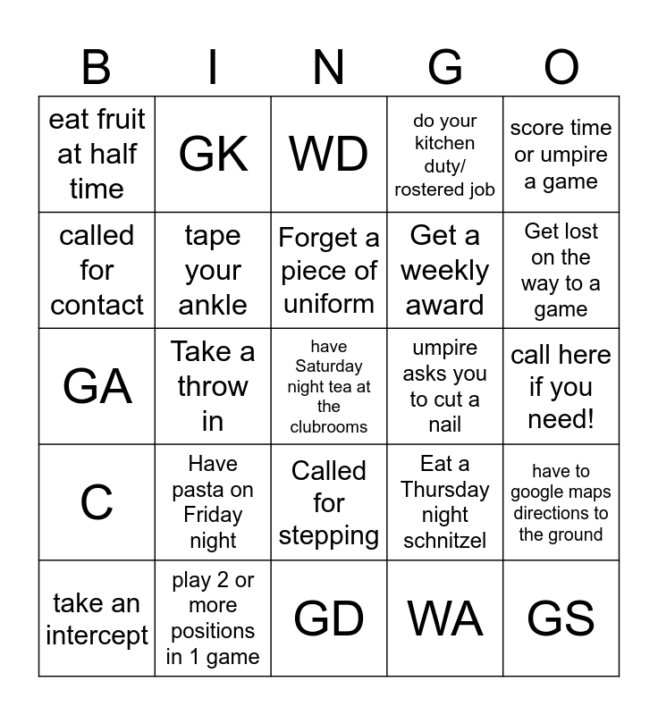 This bingo card has 25 words: C, play 2 or more positions in 1 game, have Saturday night tea at the clubrooms, WA, score time or umpire a game, eat fruit at half time, GK, WD, umpire asks you to cut a nail, have to google maps directions to the ground, called for contact, tape your ankle, GD, Eat a Thursday night schnitzel, Get lost on the way to a game, take an intercept, Take a throw in, Forget a piece of uniform, Get a weekly award, call here if you need!, GA, Have pasta on Friday night, Called for stepping, do your kitchen duty/ rostered job and GS.