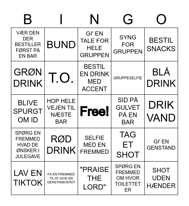 This bingo card has a free space and 24 words: RØD DRINK, FÅ EN FREMMED TIL AT GIVE EN GENSTAND/SHOT, BESTIL EN DRINK MED ACCENT, LAV EN TIKTOK, BESTIL SNACKS, VÆR DEN DER BESTILLER FØRST PÅ EN BAR, GRØN DRINK, BUND, SID PÅ GULVET PÅ EN BAR, SELFIE MED EN FREMMED, GRUPPESELFIE, BLIVE SPURGT OM ID, TAG ET SHOT, GI' EN GENSTAND, T.O., SPØRG EN FREMMED OM HVOR TOILETTET ER, DRIK VAND, GI' EN TALE FOR HELE GRUPPEN, BLÅ DRINK, HOP HELE VEJEN TIL NÆSTE BAR, SHOT UDEN HÆNDER, SPØRG EN FREMMED HVAD DE ØNSKER I JULEGAVE, SYNG FOR GRUPPEN and "PRAISE THE LORD".