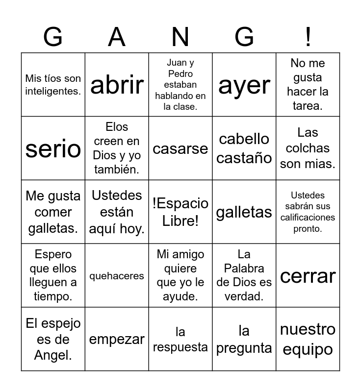 This bingo card has a free space and 29 words: El espejo es de Angel., Yo soy responsable., Ustedes están aquí hoy., Ellos van a jugar en la playa., Mis tíos son inteligentes., Juan y Pedro estaban hablando en la clase., Elos creen en Dios y yo también., quehaceres, galletas, empezar, Ustedes sabrán sus calificaciones pronto., nuestro equipo, la respuesta, la pregunta, Las colchas son mias., Tus abuelas son amables., Mi amigo quiere que yo le ayude., Espero que ellos lleguen a tiempo., No me gusta hacer la tarea., Me gusta comer galletas., La Palabra de Dios es verdad., triste, cabello castaño, serio, ayer, abrir, cerrar, casarse and llegar.