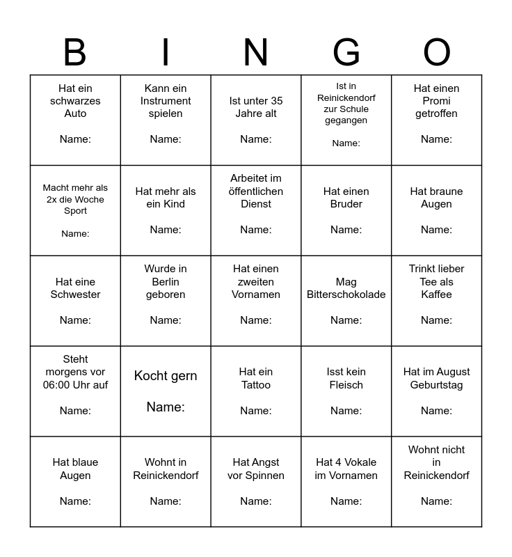 This bingo card has 35 words: Hat Lehramt studiert Name:, Wurde nicht in Berlin geboren Name:, Ist verheiratet Name:, Hat mehr als ein Kind Name:, Hat ein Tattoo Name:, Ist in Reinickendorf zur Schule gegangen Name:, Macht mehr als 2x die Woche Sport Name:, Hat einen Hund Name:, Arbeitet im öffentlichen Dienst Name:, Vorname beginnt mit einem Vokal Name:, Hat eine Schwester Name:, Hat einen Promi getroffen Name:, Hat in diesem Jahr einen Strafzettel bekommen Name:, Ist Mitglied im Fitnessstudio Name:, Hat ein schwarzes Auto Name:, Mag Bitterschokolade Name:, Hat 4 Vokale im Vornamen Name:, Wurde in Berlin geboren Name:, Steht morgens vor 06:00 Uhr auf Name:, Hat einen zweiten Vornamen Name:, Isst kein Fleisch Name:, Hat blaue Augen Name:, Hat im August Geburtstag Name:, Wohnt in Reinickendorf Name:, Ist unter 35 Jahre alt Name:, Hat braune Augen Name:, Wohnt nicht in Reinickendorf Name:, Hat im Juli Geburtstag Name:, Hat einen Bruder Name:, Trinkt lieber Tee als Kaffee Name:, Hört gern Rockmusik Name:, Hat Angst vor Spinnen Name:, Kocht gern Name:, Kann ein Instrument spielen Name: and Fährt gern Fahrrad Name:.