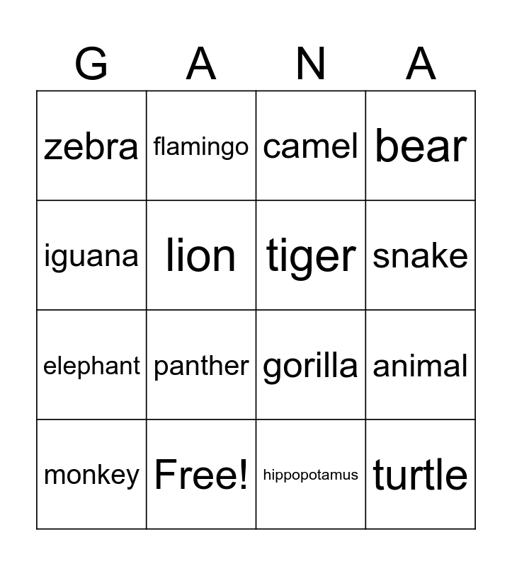 This bingo card has 16 words: Free!, animal, camel, zebra, elephant, flamingo, gorilla, hippopotamus, iguana, lion, monkey, bear, panther, snake, tiger and turtle.