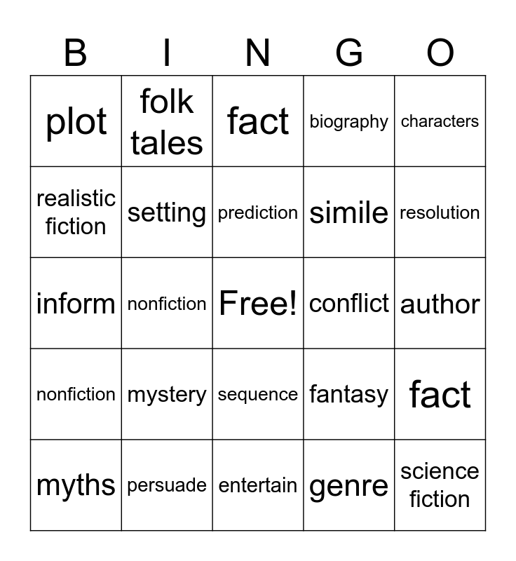 This bingo card has a free space and 34 words: poetry, genre, cause, compare, nonfiction, setting, characters, myths, folk tales, contrast, prediction, fact, autobiography, personification, conflict, resolution, persuade, inform, mystery, fantasy, sequence, historical fiction, plot, author, entertain, science fiction, biography, metaphor, simile, realistic fiction, effect, nonfiction, fact and opinion.