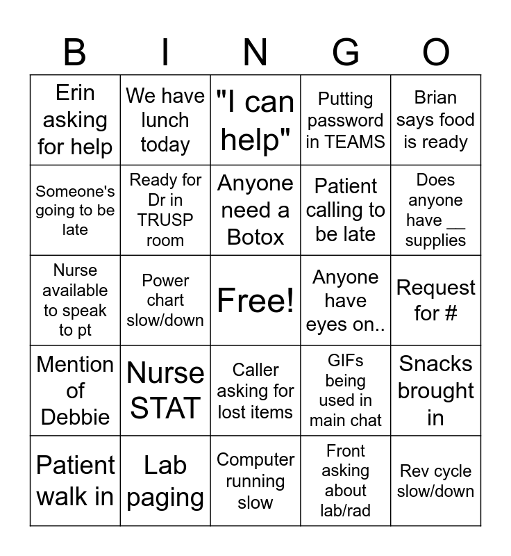 This bingo card has a free space and 24 words: Nurse STAT, Lab paging, Anyone need a Botox, Patient walk in, Brian says food is ready, Erin asking for help, Someone's going to be late, We have lunch today, Anyone have eyes on.., Caller asking for lost items, Patient calling to be late, Nurse available to speak to pt, GIFs being used in main chat, Snacks brought in, Ready for Dr in TRUSP room, Front asking about lab/rad, Request for #, "I can help", Does anyone have __ supplies, Power chart slow/down, Rev cycle slow/down, Mention of Debbie, Putting password in TEAMS and Computer running slow.