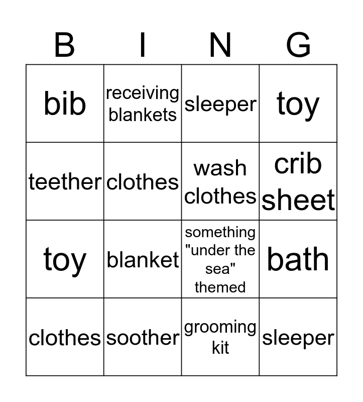 This bingo card has a free space and 15 words: clothes, sleeper, sleeper, bib, crib sheet, teether, blanket, grooming kit, clothes, toy, bath, toy, wash clothes, receiving blankets and soother.