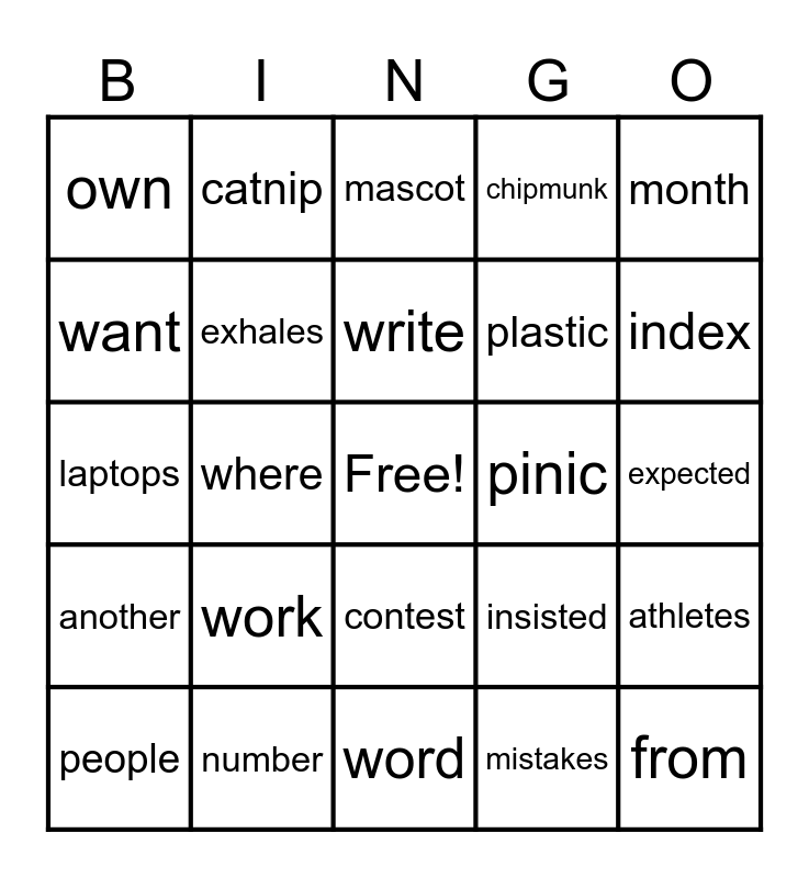 This bingo card has a free space and 25 words: work, word, write, people, month, own, want, catnip, pinic, contest, plastic, laptops, insisted, athletes, exhales, unzip, expected, mascot, index, where, from, number, another, chipmunk and mistakes.