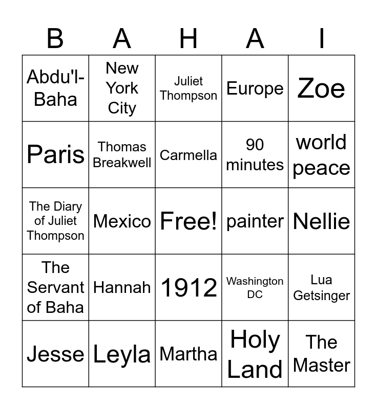 This bingo card has a free space and 24 words: Hannah, Leyla, Carmella, Jesse, Zoe, Abdu'l-Baha, Paris, New York City, painter, 1912, 90 minutes, The Diary of Juliet Thompson, Washington DC, Lua Getsinger, Thomas Breakwell, Holy Land, Nellie, Juliet Thompson, world peace, Mexico, The Master, The Servant of Baha, Europe and Martha.