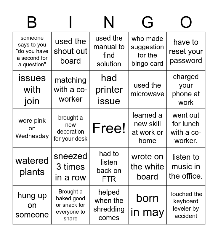 This bingo card has a free space and 24 words: hung up on someone, sneezed 3 times in a row, had printer issue, born in may, have to reset your password, someone says to you "do you have a second for a question", used the shout out board, used the manual to find solution, learned a new skill at work or home, went out for lunch with a co-worker., wore pink on Wednesday, matching with a co-worker, wrote on the white board, listen to music in the office., issues with join, Brought a baked good or snack for everyone to share, helped when the shredding comes, who made suggestion for the bingo card, charged your phone at work, watered plants, brought a new decoration for your desk, had to listen back on FTR, used the microwave and Touched the keyboard leveler by accident.