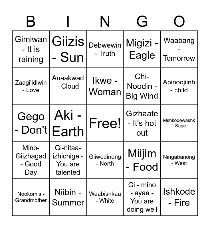 This bingo card has a free space and 74 words: Bekaa - Wait, Anang - Star, Debwewin - Truth, Mishoomis - Grandfather, Asemaa - Tobacco, Dewe'igan - Drum, Nibi - Water, Ode'imin - Strawberry, Nookomis - Grandmother, Bizindam - Listen, Giizhik - Cedar, Ziibi - River, Ikwe - Woman, Zaagi'idiwin - Love, Miigwan - Feather, Aki - Earth, Giinawind - All of us, Abinoojiinh - child, Bakade - Hungry, Gego - Don't, Anaakwad - Cloud, Giizis - Sun, Migizi - Eagle, Ayekozi - Tired, Ishkode - Fire, Miigwetch - Thank you, Nimadabin - Sit, Zoongide'ewin - Courage, Mashkiki - Medicine, Noongom - Today, Waabang - Tomorrow, Mino ezhinchigen - Good Job, Bii-izhaan omma - Come Here, Niibawin - Stand, Ni-mino- ayaa - I am doing well, Gi - mino - ayaa - You are doing well, Ni-giwaabamin miinawaa - I will see you again, Miskwaa - Red, Ozaawaa - Yellow, Makadewaa - Black, Waabishkaa - White, Niibin - Summer, Ziigwan - Spring, Biboon - Winter, Dagwaagin - Autumn, Gimiwan - It is raining, Gi-gichi-inendaagoz - You are important, Gi-nitaa-izhichige - You are talented, Daga - Please, Goshkozin - Wake up, Nindizhinikaaz - My Name, Wiingashk - Sweetgrass, Mshkodewashk - Sage, Pwaagan - Pipe, Makwa - Bear, Amik - Beaver, Giiwedinong - North, Zhaawanong - South, Waabanong - East, Ningabanong - West, Chi-Noodin - Big Wind, Animkiikaa - Thunder, Mino-Giizhagad - Good Day, Dakiyaa - It's cool out, Gizhaate - It's hot out, Adik - Caribou, Waawashkeshi - Deer, Boozhoo/Aniin - Hello, Miijim - Food, Gizhewaadizi - S/he is kind, generous, Dabasendizowin - Humility, Gidinawendimin - We are all related, Gisinaa - It is cold outside and Man - Inini.