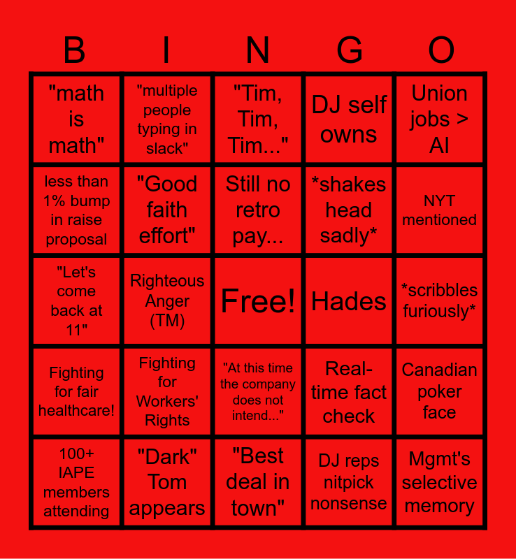 This bingo card has a free space and 25 words: Fighting for Workers' Rights, "Best deal in town", Still no retro pay..., 100+ IAPE members attending, Union jobs > AI, "math is math", less than 1% bump in raise proposal, "multiple people typing in slack", Hades, "At this time the company does not intend...", *shakes head sadly*, "Let's come back at 11", Real-time fact check, Canadian poker face, "Good faith effort", Company reps show up late, *scribbles furiously*, "Tim, Tim, Tim...", NYT mentioned, Righteous Anger (TM), Mgmt's selective memory, "Dark" Tom appears, Fighting for fair healthcare!, DJ self owns and DJ reps nitpick nonsense.