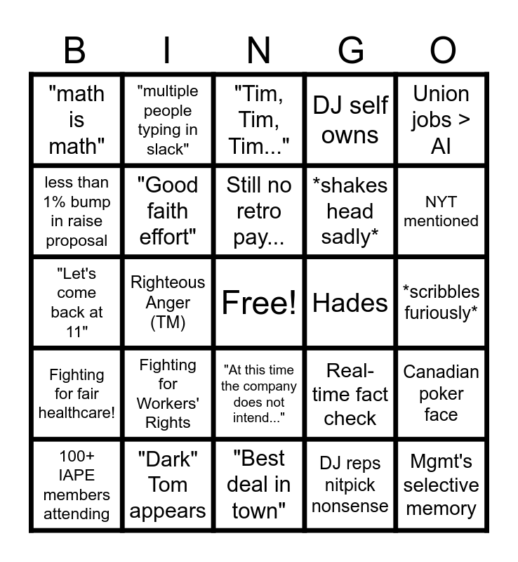 This bingo card has a free space and 25 words: Fighting for Workers' Rights, "Best deal in town", Still no retro pay..., 100+ IAPE members attending, Union jobs > AI, "math is math", less than 1% bump in raise proposal, "multiple people typing in slack", Hades, "At this time the company does not intend...", *shakes head sadly*, "Let's come back at 11", Real-time fact check, Canadian poker face, "Good faith effort", Company reps show up late, *scribbles furiously*, "Tim, Tim, Tim...", NYT mentioned, Righteous Anger (TM), Mgmt's selective memory, "Dark" Tom appears, Fighting for fair healthcare!, DJ self owns and DJ reps nitpick nonsense.