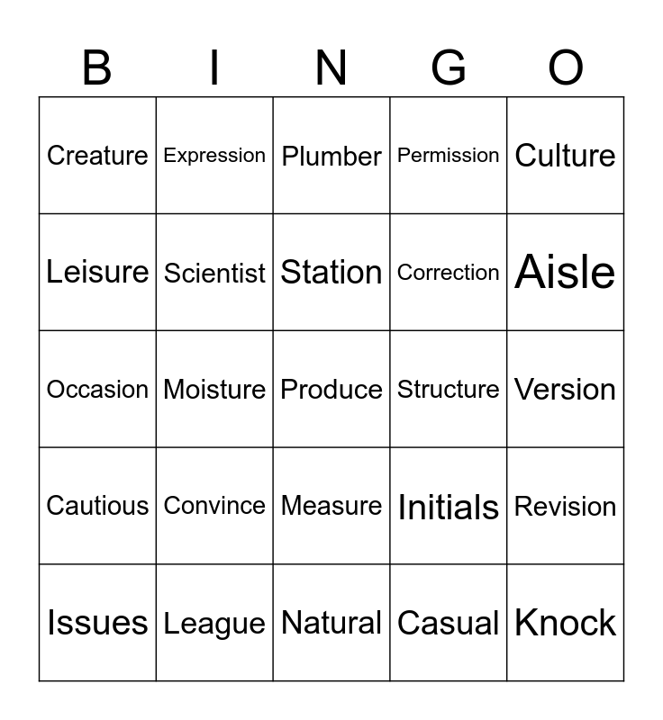 This bingo card has a free space and 24 words: Convince, League, Station, Issues, Culture, Creature, Leisure, Expression, Structure, Measure, Correction, Occasion, Initials, Revision, Scientist, Casual, Version, Plumber, Aisle, Moisture, Knock, Cautious, Permission and Natural.