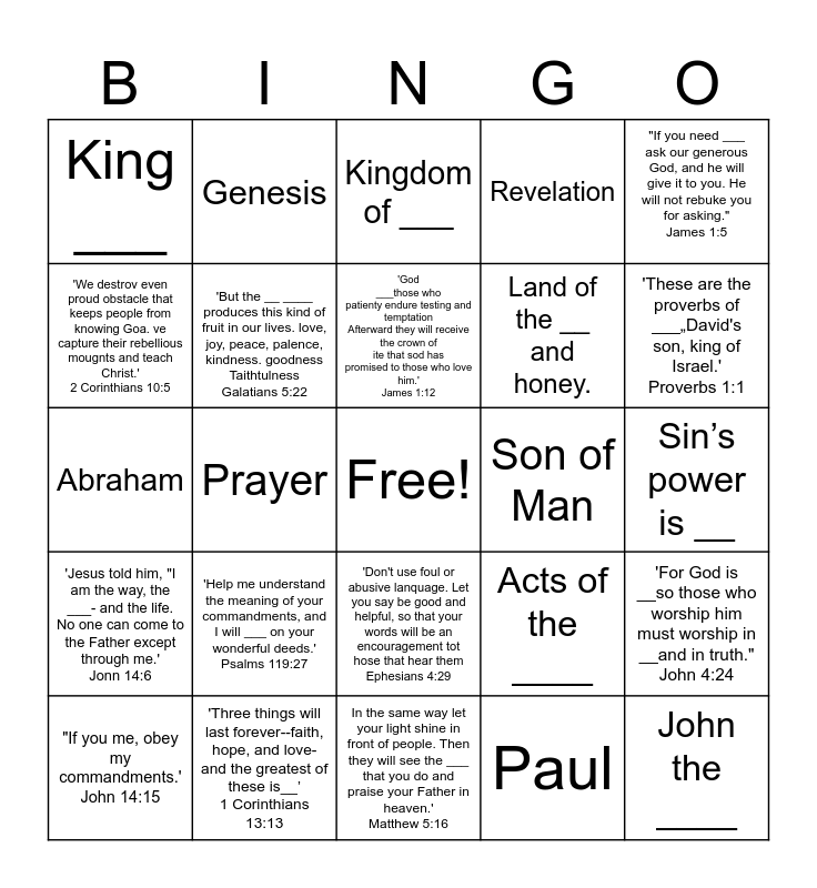 This bingo card has a free space and 24 words: 'Help me understand the meaning of your commandments, and I will ___ on your wonderful deeds.' Psalms 119:27, 'Three things will last forever--faith, hope, and love-and the greatest of these is__’ 1 Corinthians 13:13, 'God ___those who patienty endure testing and temptation Afterward they will receive the crown of ite that sod has promised to those who love him.' James 1:12, "If you me, obey my commandments.' John 14:15, "If you need ___ ask our generous God, and he will give it to you. He will not rebuke you for asking." James 1:5, King ___, 'We destrov even proud obstacle that keeps people from knowing Goa. ve capture their rebellious mougnts and teach Christ.' 2 Corinthians 10:5, Genesis, Son of Man, 'Don't use foul or abusive lanquage. Let you say be good and helpful, so that your words will be an encouragement tot hose that hear them Ephesians 4:29, Land of the __ and honey., Abraham, Acts of the ____, 'For God is __so those who worship him must worship in __and in truth." John 4:24, 'But the __ ____ produces this kind of fruit in our lives. love, joy, peace, palence, kindness. goodness Taithtulness Galatians 5:22, Paul, Sin’s power is __, Kingdom of ___, 'These are the proverbs of ___„David's son, king of Israel.' Proverbs 1:1, Prayer, John the ____, 'Jesus told him, "I am the way, the ___- and the life. No one can come to the Father except through me.' Jonn 14:6, Revelation and In the same way let your light shine in front of people. Then they will see the ___ that you do and praise your Father in heaven.' Matthew 5:16.