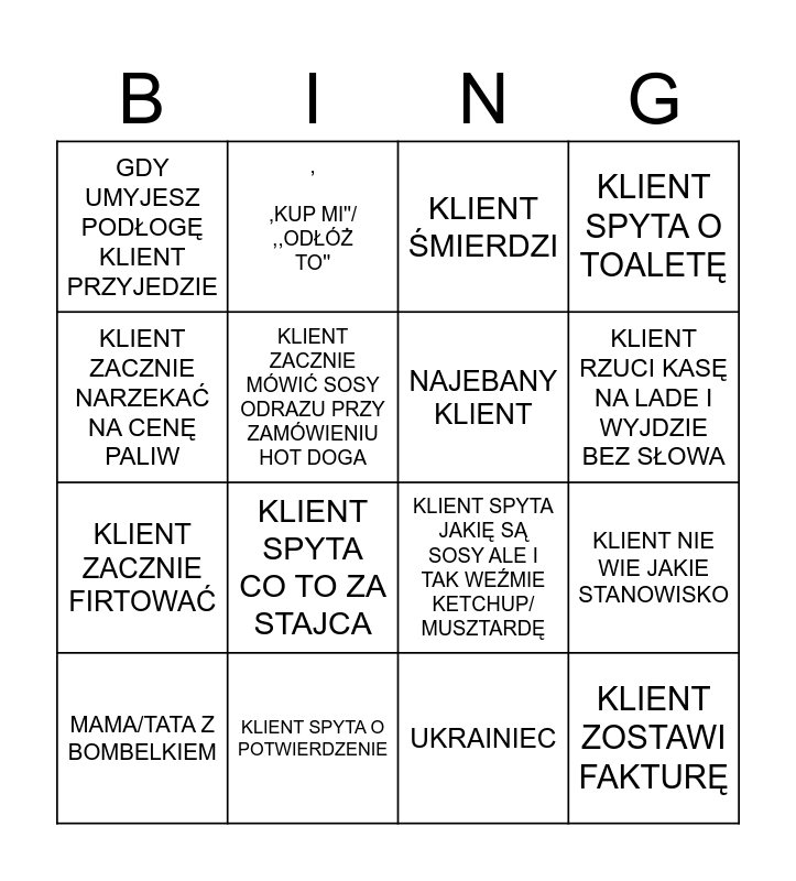 This bingo card has 18 words: KLIENT SPYTA CO TO ZA STAJCA, KLIENT ZOSTAWI FAKTURĘ, KLIENT ŚMIERDZI, GDY UMYJESZ PODŁOGĘ KLIENT PRZYJEDZIE, KLIENT SPYTA JAKIĘ SĄ SOSY ALE I TAK WEŹMIE KETCHUP/ MUSZTARDĘ, KLIENT SPYTA O TOALETĘ, MAMA/TATA Z BOMBELKIEM, , ,KUP MI''/ ,,ODŁÓŻ TO'', KLIENT RZUCI KASĘ NA LADE I WYJDZIE BEZ SŁOWA, KLIENT ZACZNIE FIRTOWAĆ, UKRAINIEC, KLIENT ZACZNIE NARZEKAĆ NA CENĘ PALIW, KLIENT NIE WIE JAKIE STANOWISKO, KLIENT ZACZNIE MÓWIĆ SOSY ODRAZU PRZY ZAMÓWIENIU HOT DOGA, NAJEBANY KLIENT, UBRANY W NARTWY KLUBU JAKIEGOŚ, KLIENT SPYTA O POTWIERDZENIE and PONAD 50 HOTDOGÓW NA ZAMIENIE.