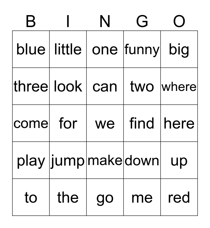 This bingo card has a free space and 24 words: jump, the, can, to, big, blue, three, little, find, make, two, come, down, up, look, me, here, one, where, for, red, play, funny and go.