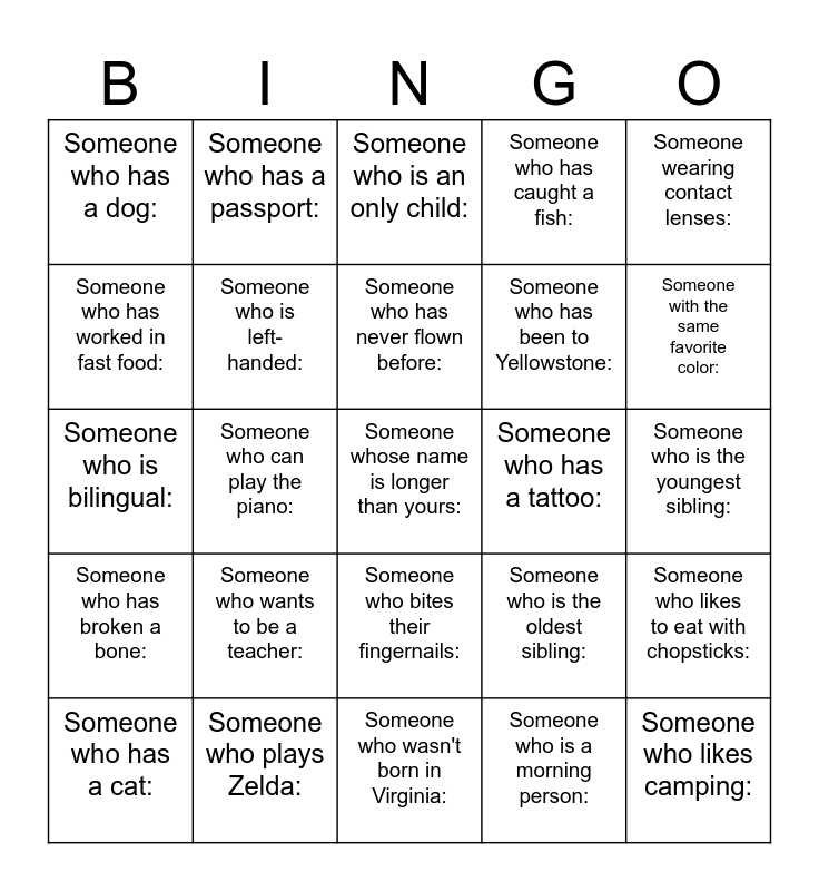 This bingo card has 30 words: Someone who plays Zelda:, Someone who doesn't drink coffee:, Someone who can play the piano:, Someone who orders pizza the same as you:, Someone who has a dog:, Someone who is an only child:, Someone who is left-handed:, Someone who bites their fingernails:, Someone who has a tattoo:, Someone who wasn't born in Virginia:, Someone who is the youngest sibling:, Someone whose name is longer than yours:, Someone who is a morning person:, Someone who likes camping:, Someone with the same favorite color:, Someone who has ridden a train:, Someone who is the oldest sibling:, Someone who has broken a bone:, Someone who wants to be a teacher:, Someone wearing contact lenses:, Someone who is bilingual:, Someone who shares your birth month:, Someone who has a passport:, Someone who has been to Yellowstone:, Someone who has worked in fast food:, Someone who has caught a fish:, Someone who likes to eat with chopsticks:, Someone who has a cat:, Someone who has never flown before: and Someone who has ridden a horse:.
