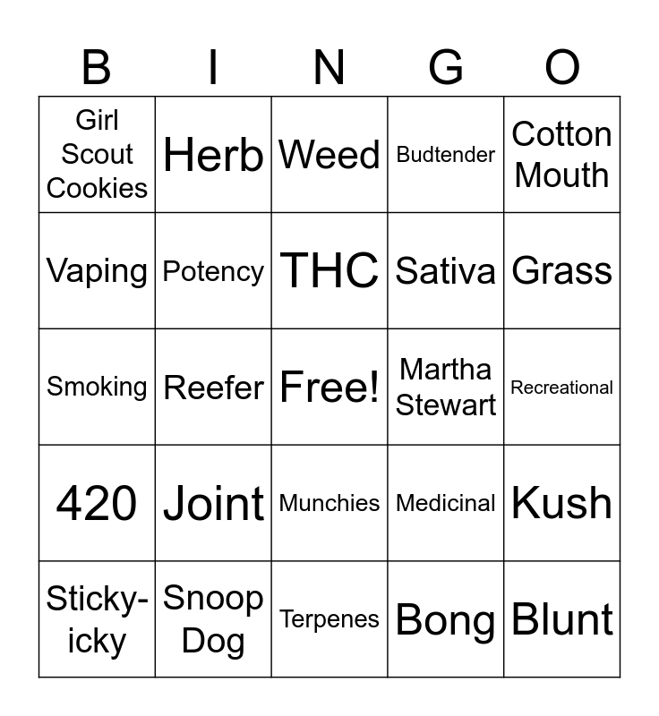 This bingo card has a free space and 42 words: Marijuana, THC, Memory, Joint, Bong, Kush, Blunt, Moon Rock, Weed, Munchies, Recreational, Grass, Reefer, Cotton Mouth, Northern Light, Medicinal, Cannabis, Smoking, Diesel, Herb, Vaping, Dabbing, Mary Jane, Girl Scout Cookies, Concentrates, Edibles, Sativa, Indica, Hybrid, Strain, Dispensary, 420, Potency, Terpenes, In Da Couch, Sticky-icky, Snoop Dog, Martha Stewart, Cheech & Chong, Puff Puff Pass, Budtender and Last Prisoner Project.