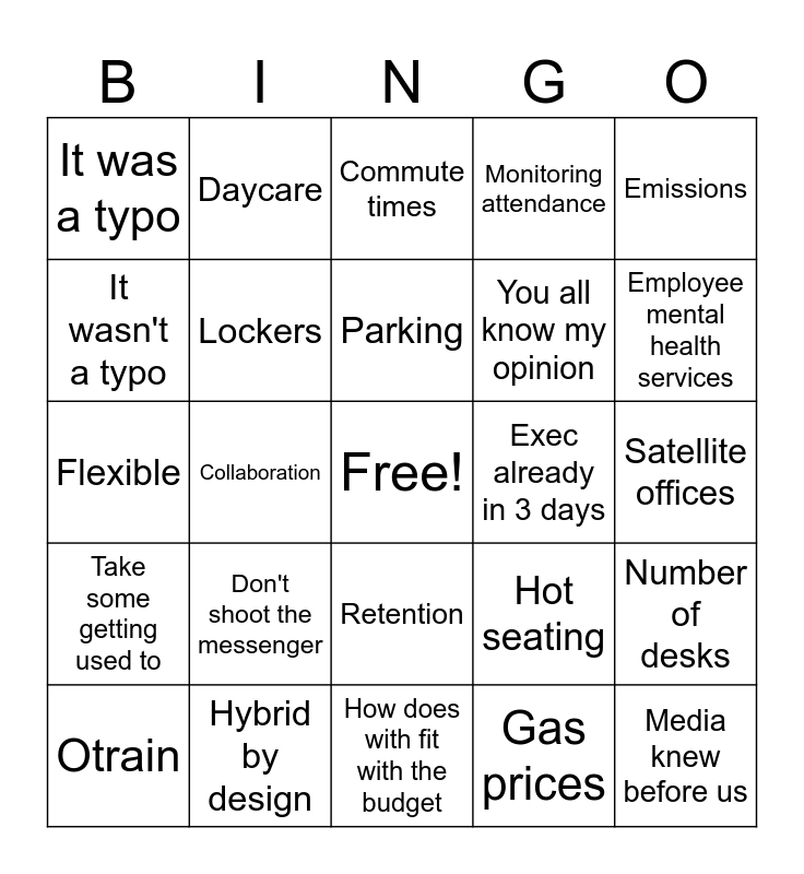 This bingo card has a free space and 24 words: Don't shoot the messenger, Hybrid by design, Parking, Otrain, Emissions, It was a typo, It wasn't a typo, Daycare, Exec already in 3 days, Retention, You all know my opinion, Flexible, Hot seating, Number of desks, Lockers, Gas prices, Satellite offices, Commute times, Employee mental health services, Collaboration, Media knew before us, Take some getting used to, Monitoring attendance and How does with fit with the budget.